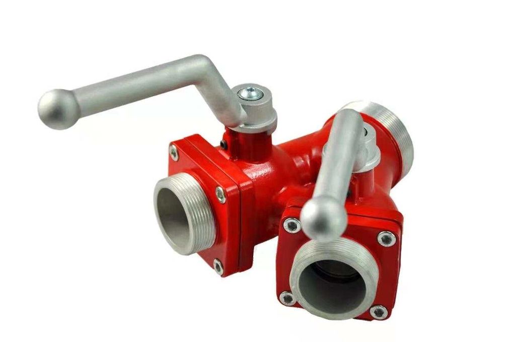 ข้อแยก 3 ทาง ดับเพลิง แบบมีบอลวาล์ว 2 ตัว ทางน้ำเข้า เป็นข้อต่อสวมเร็วตัวผู้ ขนาด 2.5 นิ้ว และทางน้ำออกเป็นข้อต่อสวมเร็วตัวเมียขนาด 2.5 นิ้ว 2 ทาง